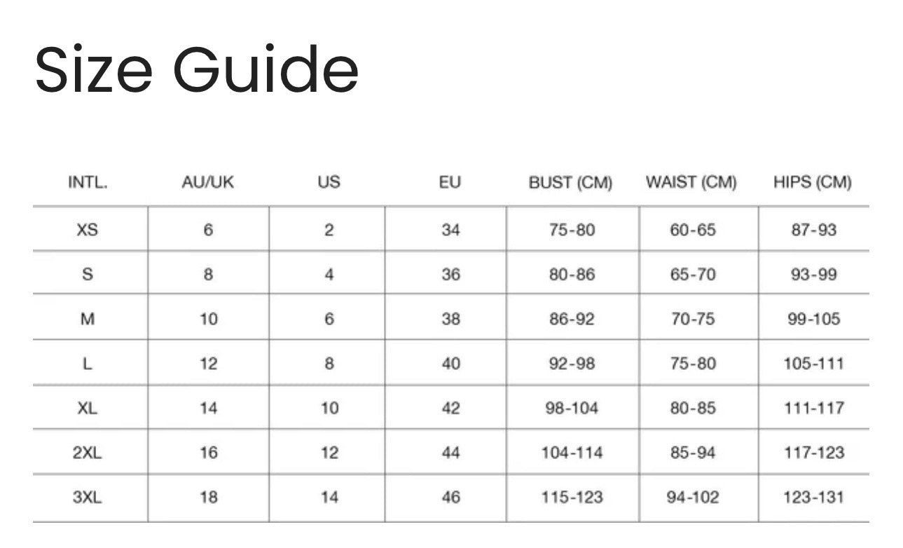 Mia is wearing a Size S. She usually wears a size AU8, is 170cm (5’8”) tall, with an 87cm (34”) bust, 72cm (28”) waist, and 88cm (34”) hips