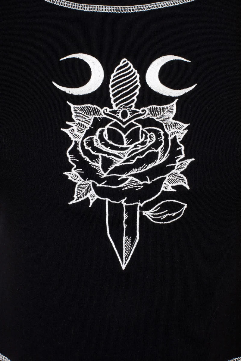 - Contrasting white embroidery of rose and dagger on centre front