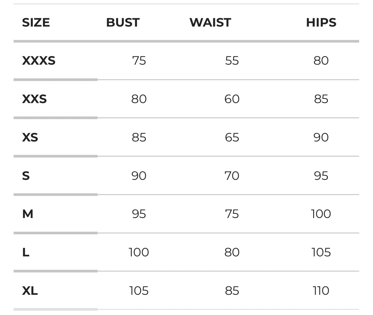 Our model is 168cm (5’6”) tall with an 81cm (32”) bust, a 64cm (25”) waist and 89cm (35”) hips".